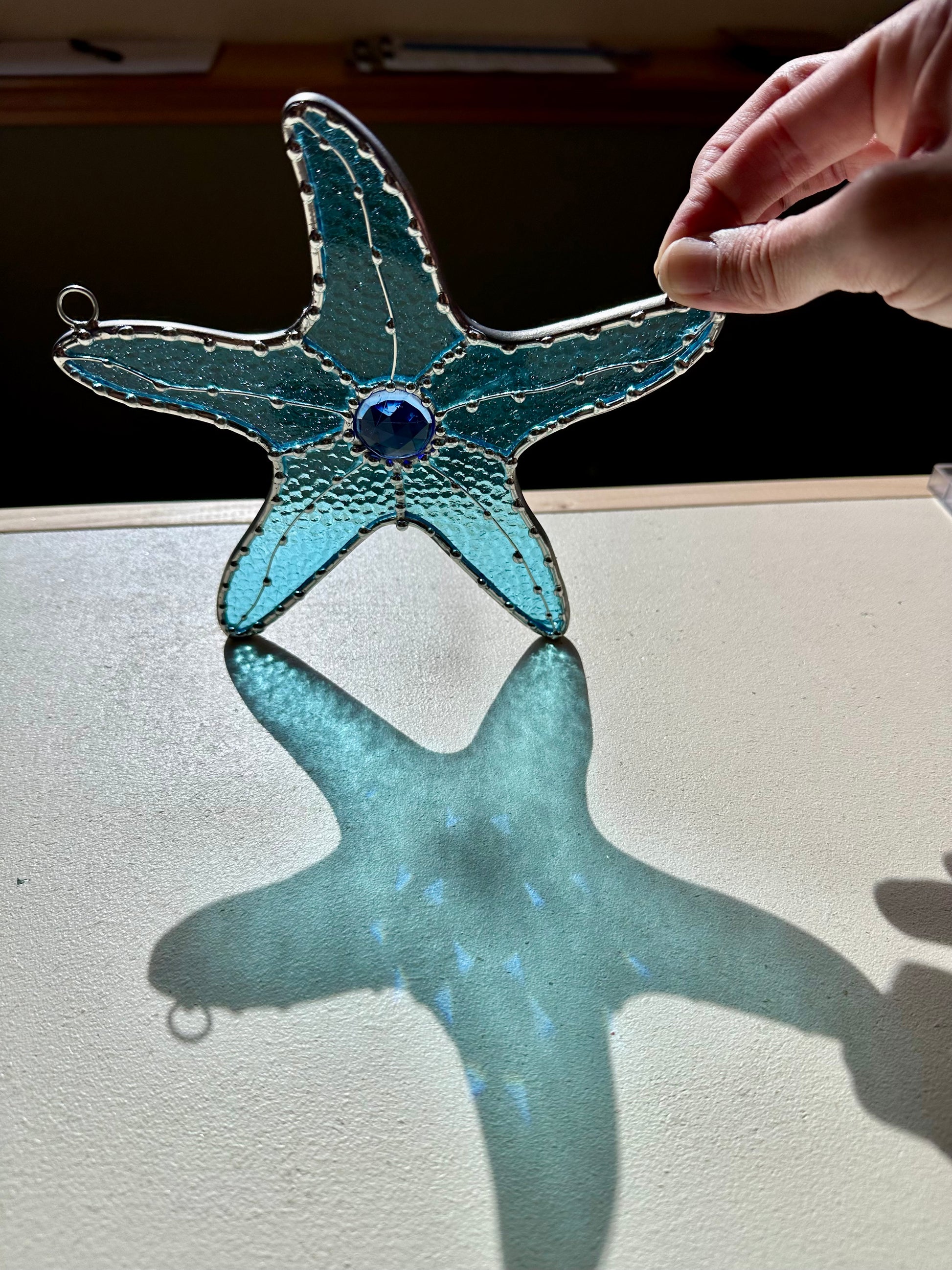 Bring a splash of coastal serenity to your space with this handcrafted stained glass starfish. Measuring approximately 7 inches across, this piece is created using light blue hammered Kokomo glass, known for its subtle texture and beautiful aqua tones that dance in the sunlight.